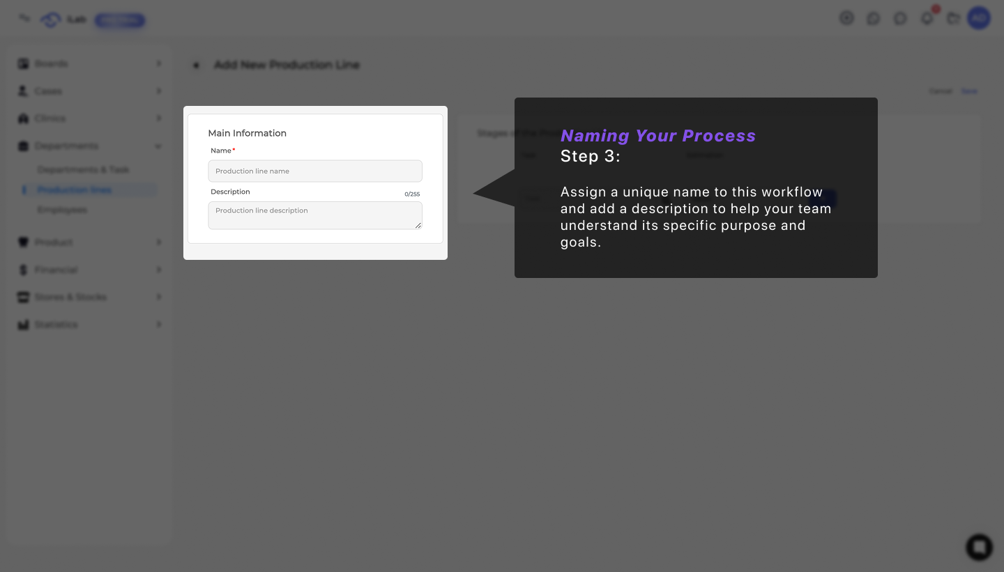 Every workflow needs a clear starting point. Enter a unique name for the production line and use the description box to define its specific purpose and goals for your laboratory team.