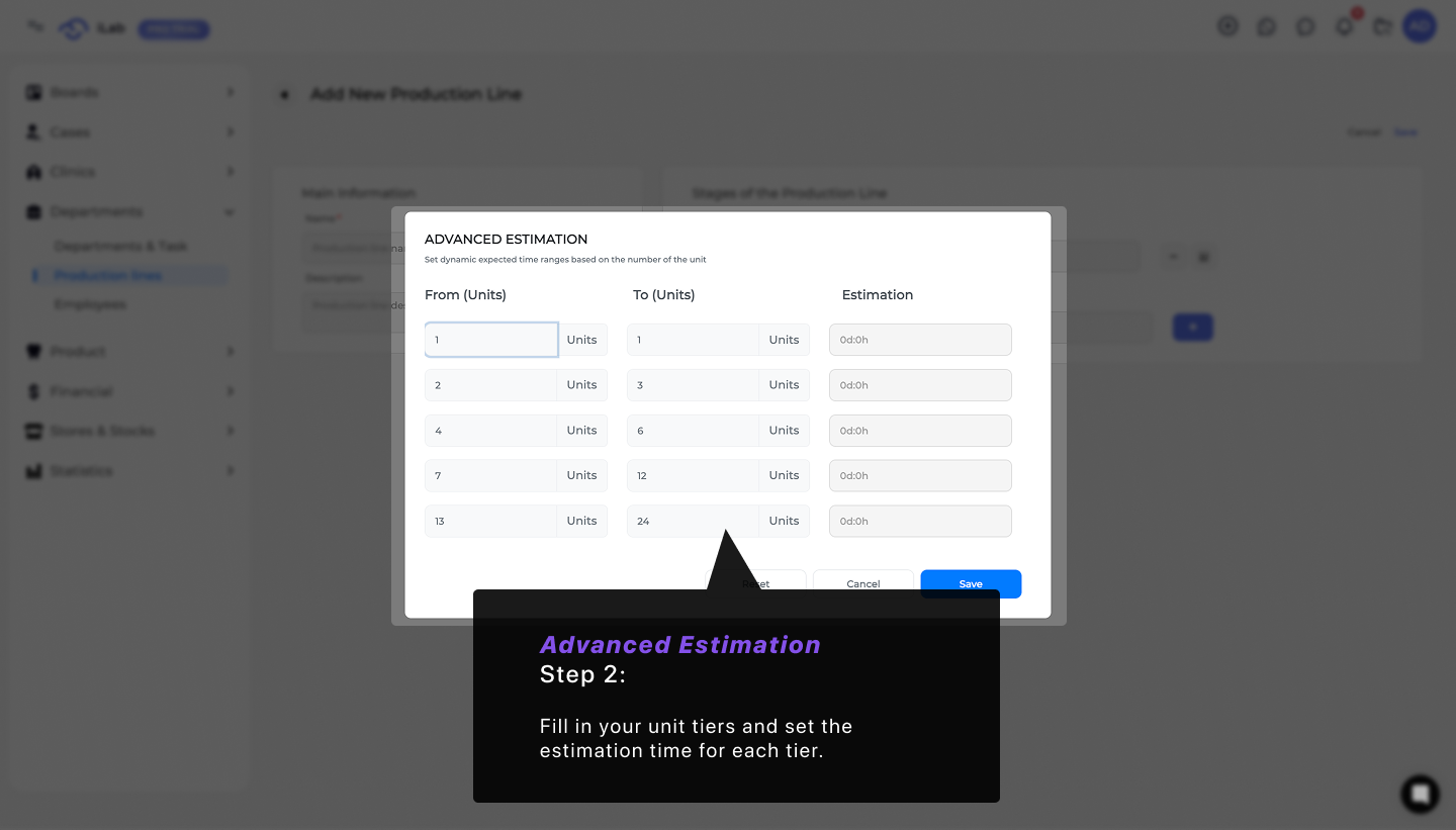 In the popup, define your volume ranges (e.g., 1–3 units, 4–12 units). For each tier, enter the specific hours and minutes required. Once you hit Save, the system will automatically calculate the correct production time based on the actual size of every new case.
