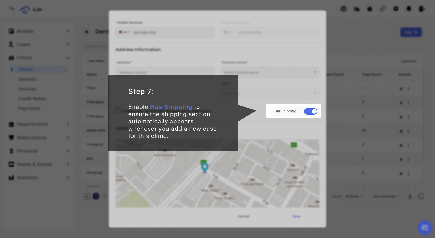 Enable the "Has Shipping" toggle to ensure a shipping section automatically appears for every new case added to this clinic. This streamlines the workflow and ensures logistical consistency for all future orders.