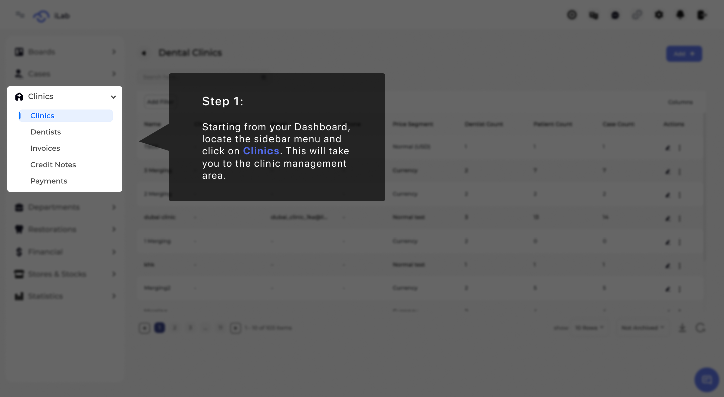 Begin by accessing your main dashboard menu on the left side of the screen. Look for the "Clinics" section and select the Clinics option to view your current list of registered practices and management tools.