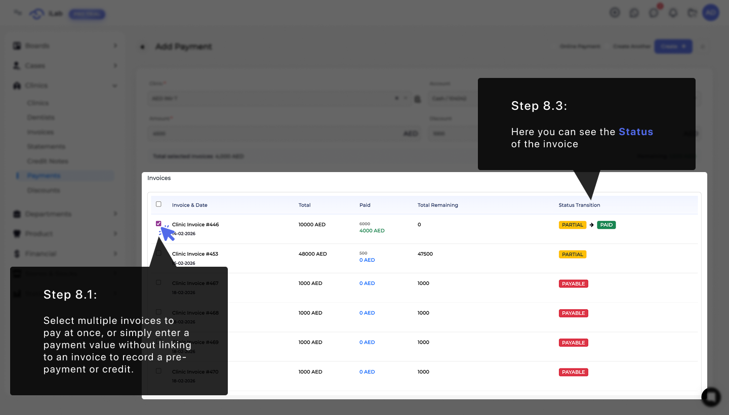 Process multiple invoices in a single payment, or simply enter a payment value to record money ahead of work without linking to a specific invoice. The system automatically calculates the totals and applies them to your balance. As well as you can see the Status of the invoice as payments are recorded and the balance is updated.