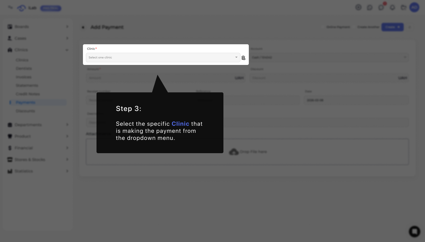 The first thing you need to do in the new window is identify which clinic is paying. Go to the Clinic box and choose the name of the specific clinic from the list in the dropdown menu. This step is very important because it makes sure the money is added to the correct account and shows up in that clinic's history.