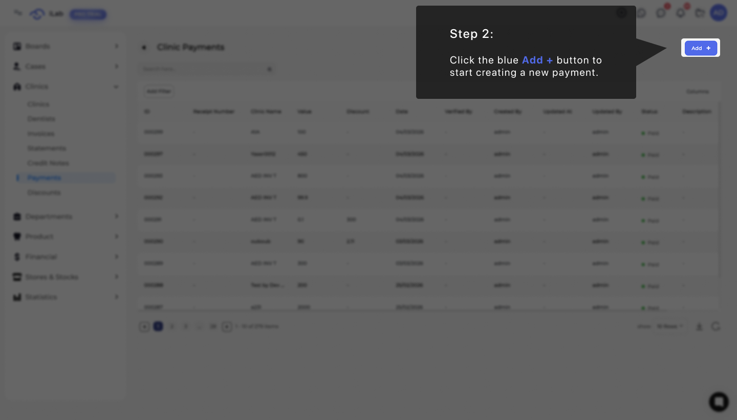Once you are on the Clinic Payments page, you can start a new payment by clicking the blue + Add button at the top right of the screen. This opens the "Add Payment" window where you will fill in the details about the money being received.