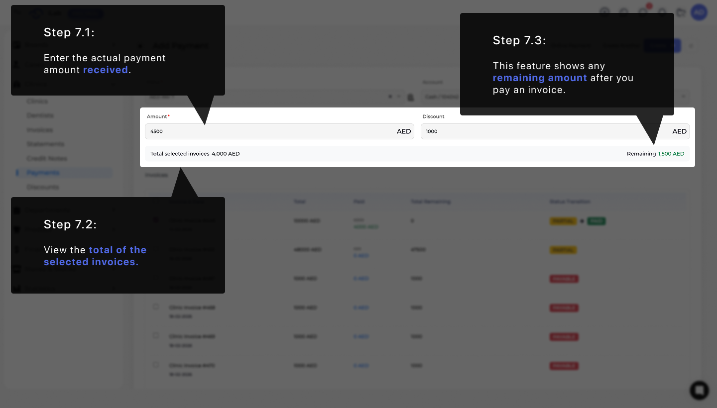 Below is an example of how the payment process might look. In this step, you enter the payment amount and apply any applicable discount. The system automatically calculates the total of the selected invoices and updates the remaining balance.