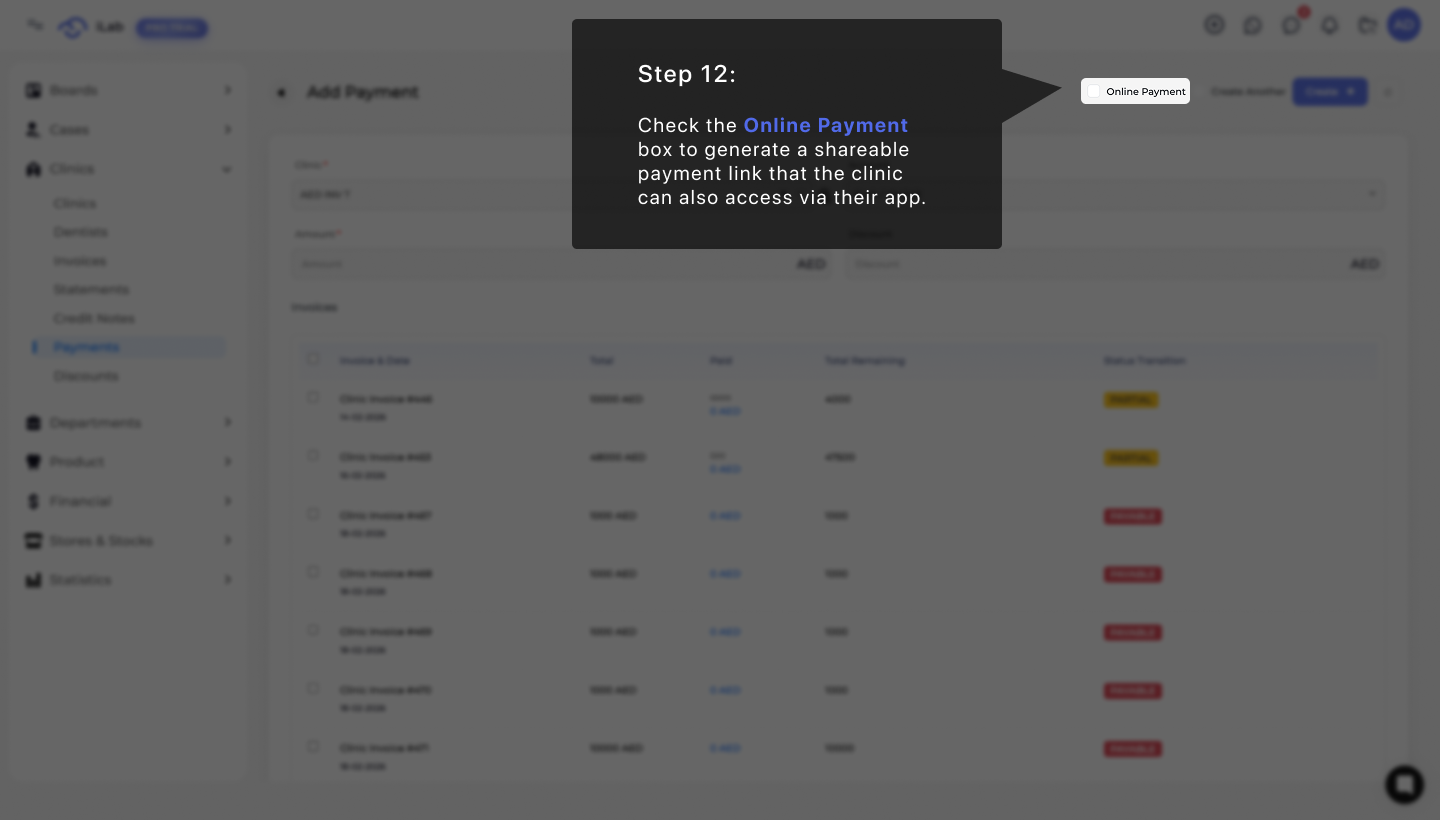 Check the Online Payment box at the top of the window to generate a shareable payment link for the clinic. When this feature is turned on, the clinic can see the request and complete the payment through their own app, making the process much faster for everyone.