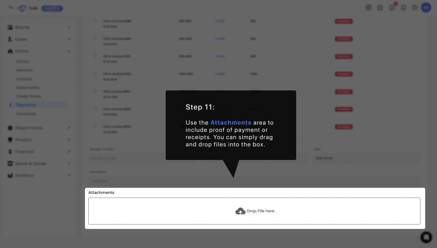 Use the Attachments area at the bottom to include proof of payment or receipts for your records. To make this process quick, you can simply drag and drop your files directly into the box that says "Drop File here". This helps keep all your digital receipts and physical documents in one safe place.