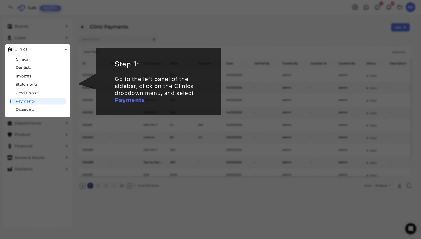 To begin, navigate to the main dashboard menu on the left side of your screen. Select the Clinics Payment option to open the management area where you can view existing billing records or start a new entry.