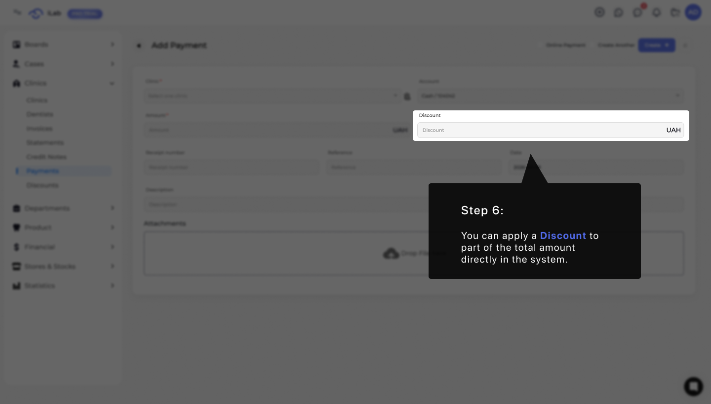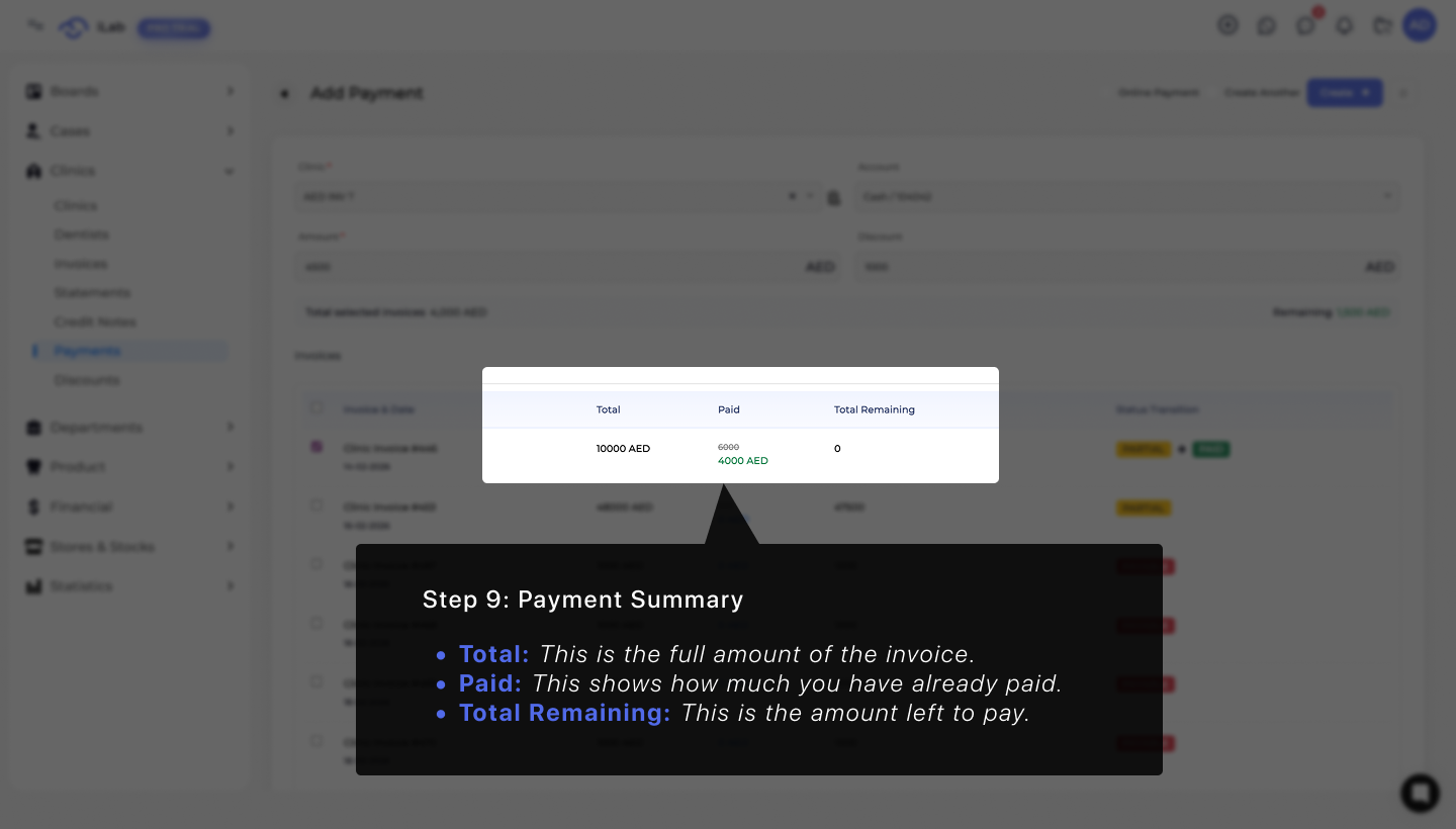 In this step, a discount can be applied to reduce part of the total invoice. The system automatically updates the remaining balance and adjusts the invoice status based on the new total.
