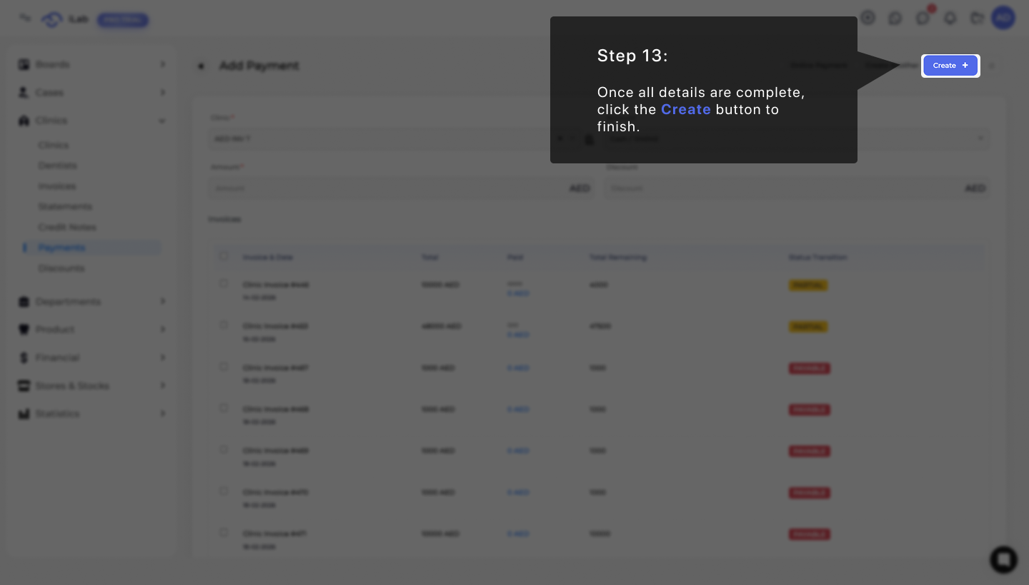 Once you have checked that all the details are complete and correct, look for the blue button at the top right. Click the Create + button to save the transaction and finish creating the new payment record in the system.