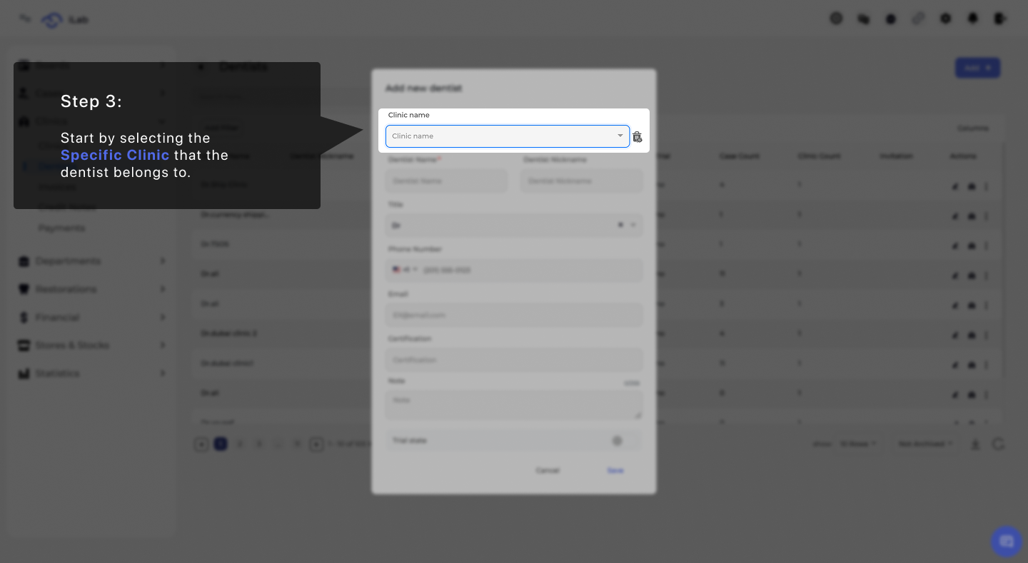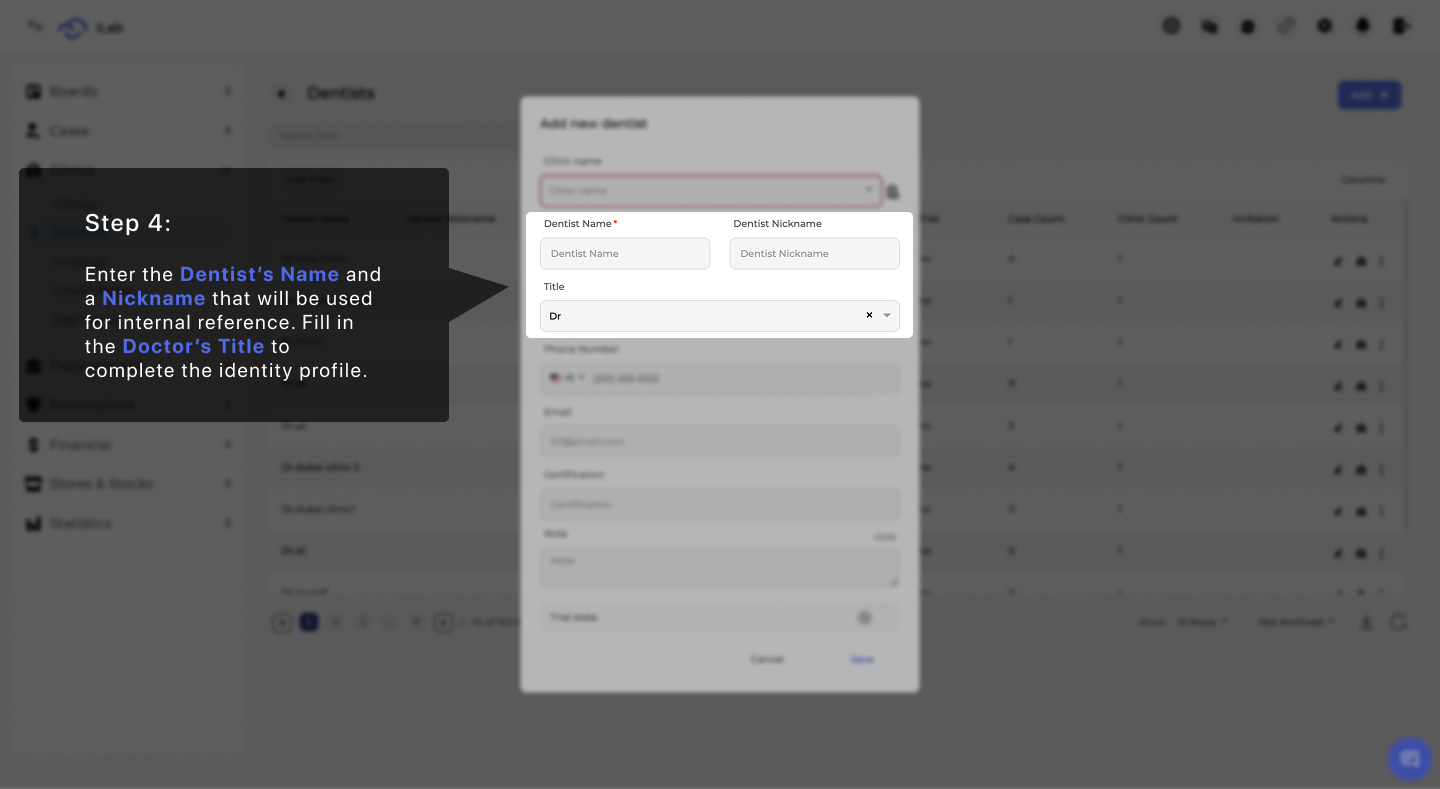 Guide to add a dentist in iLab: link them to a clinic, enter professional details, and set treatment preferences to create their profile.