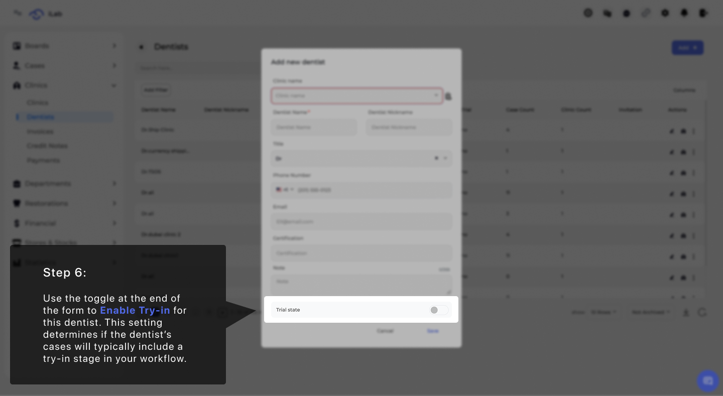 Use the toggle at the bottom to customize how the lab handles this doctor's cases. If you Enable Try-in, the system will automatically add a try-in stage to their workflow. This helps match the lab's process to the dentist's specific clinical requirements.