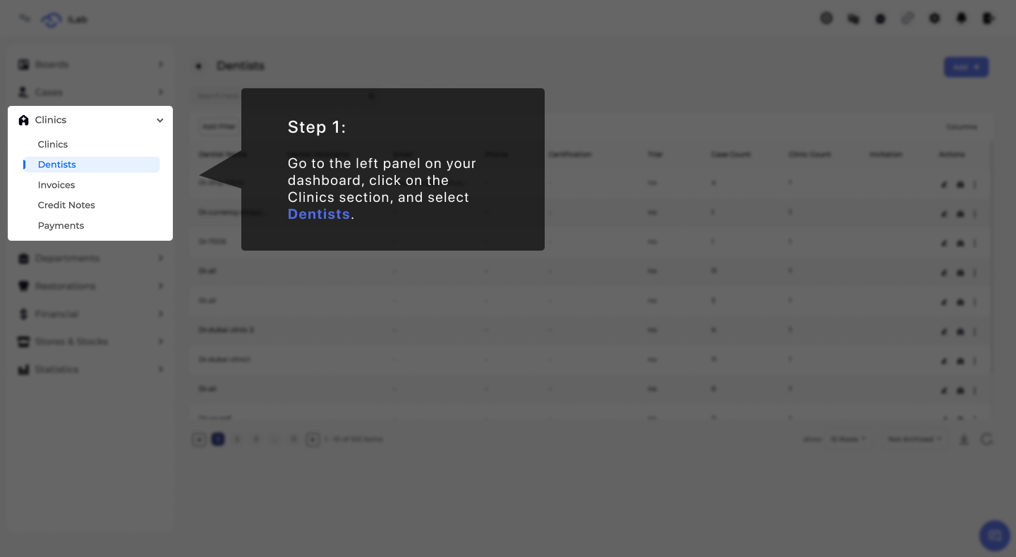 To begin, go to the left panel on your dashboard. Look for the Clinics section, click on it, and then select Dentists from the list.