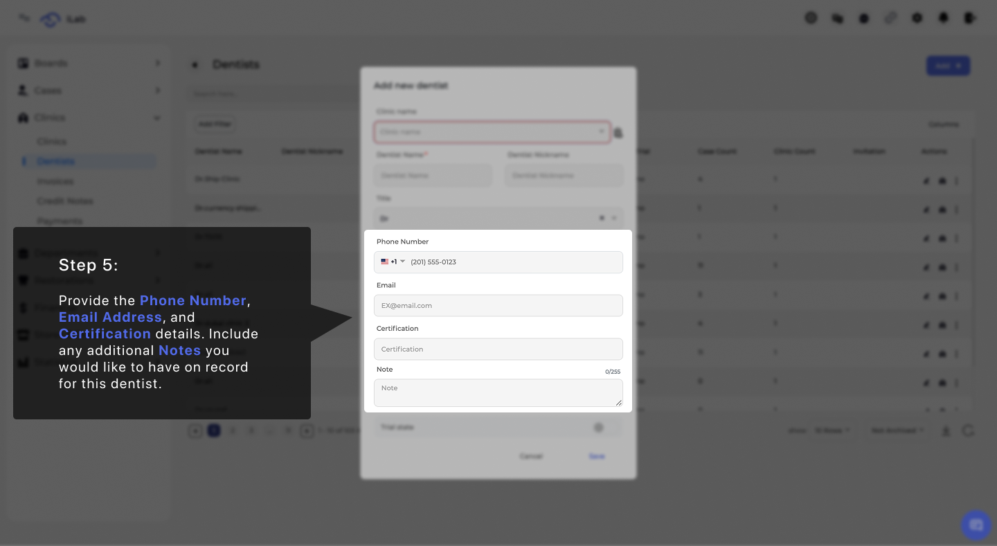 This section is for the dentist’s contact info and professional credentials. Enter their Phone Number and Email Address so they can receive case updates. You can also record their Certifications and use the Notes box to save any specific clinical preferences they have.