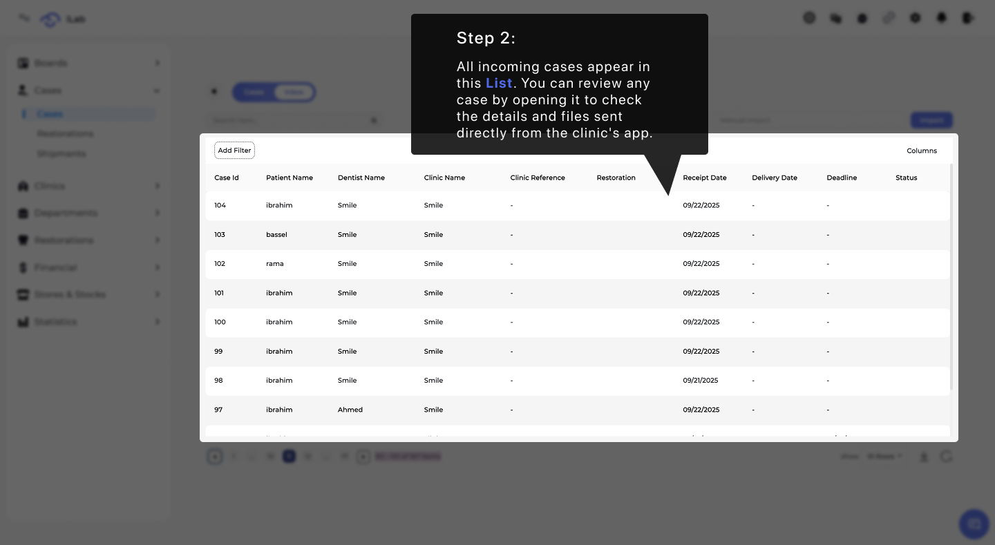 All new cases sent directly from a clinic’s app will appear in this list. You should open each case to look over the details and files the clinic sent. This helps you understand exactly what the lab needs to do for that order.