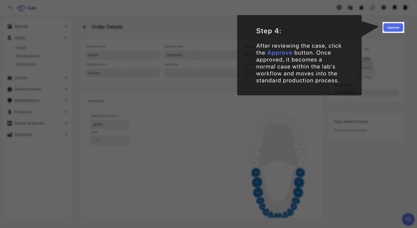 Once you have finished checking all the information and files for a new order, click the blue Approve button. After you click this, the order is no longer just a request in the Inbox; it becomes a normal case that moves into your lab's standard production workflow.