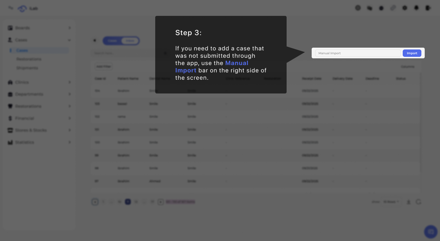If a clinic is not connected to your lab's system, they will send you a case link. To add these orders to your list, paste the link into the Manual Import bar on the right side of your screen. This tool helps you keep all your work in one place. Instead of typing in every detail yourself, the link imports the information for you so you can start tracking the case immediately.
